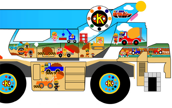 右面同様、紀州レンジャー達は和歌山をきれいにするため一生懸命工事をしている。 クレーン車以外の工事車両も操作している。 和歌山らしい風景の中、工事をしているイメージ。 トラクターが耕している畑のあぜ道を通る小学生もいてる。